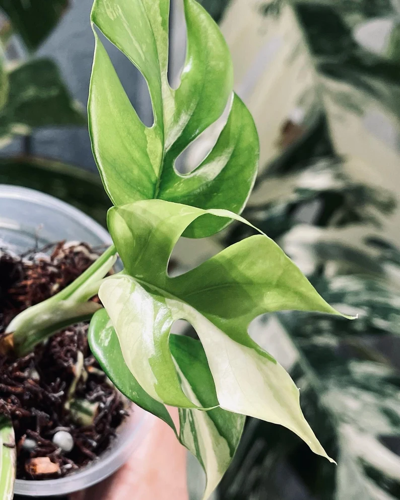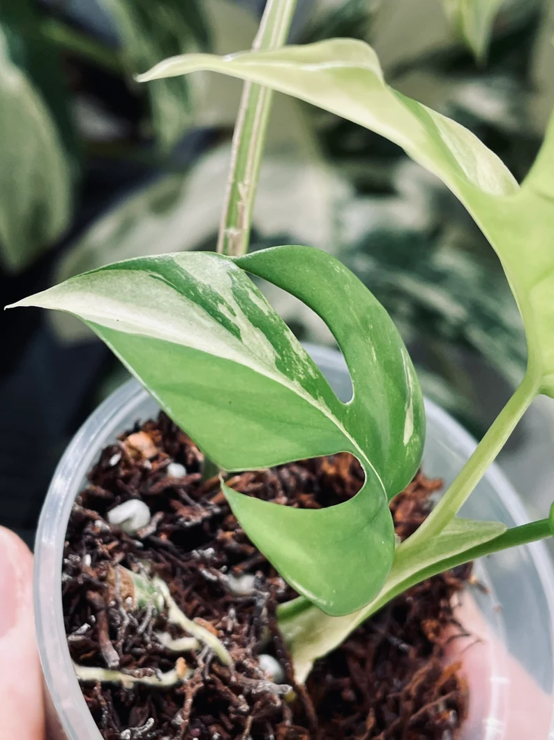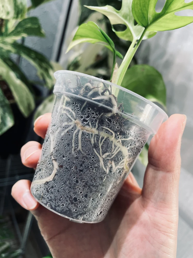 A one leaf propagation grown for two months with new shoot consisting 3 beautiful and well variegated pristine leaves. Good balance of green and white is sustainable for this plant. Extremely healthy with white clean roots as seen in the photos.