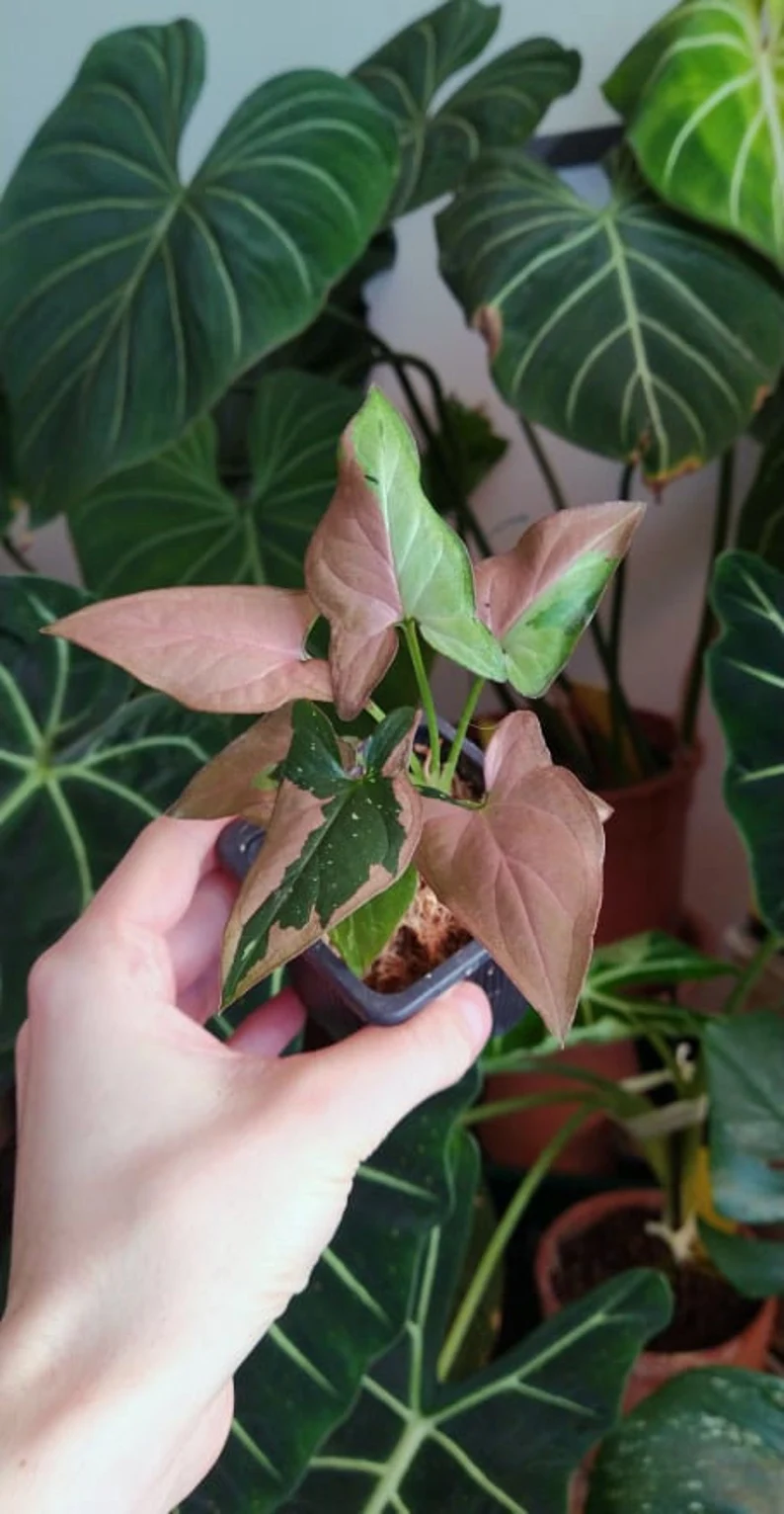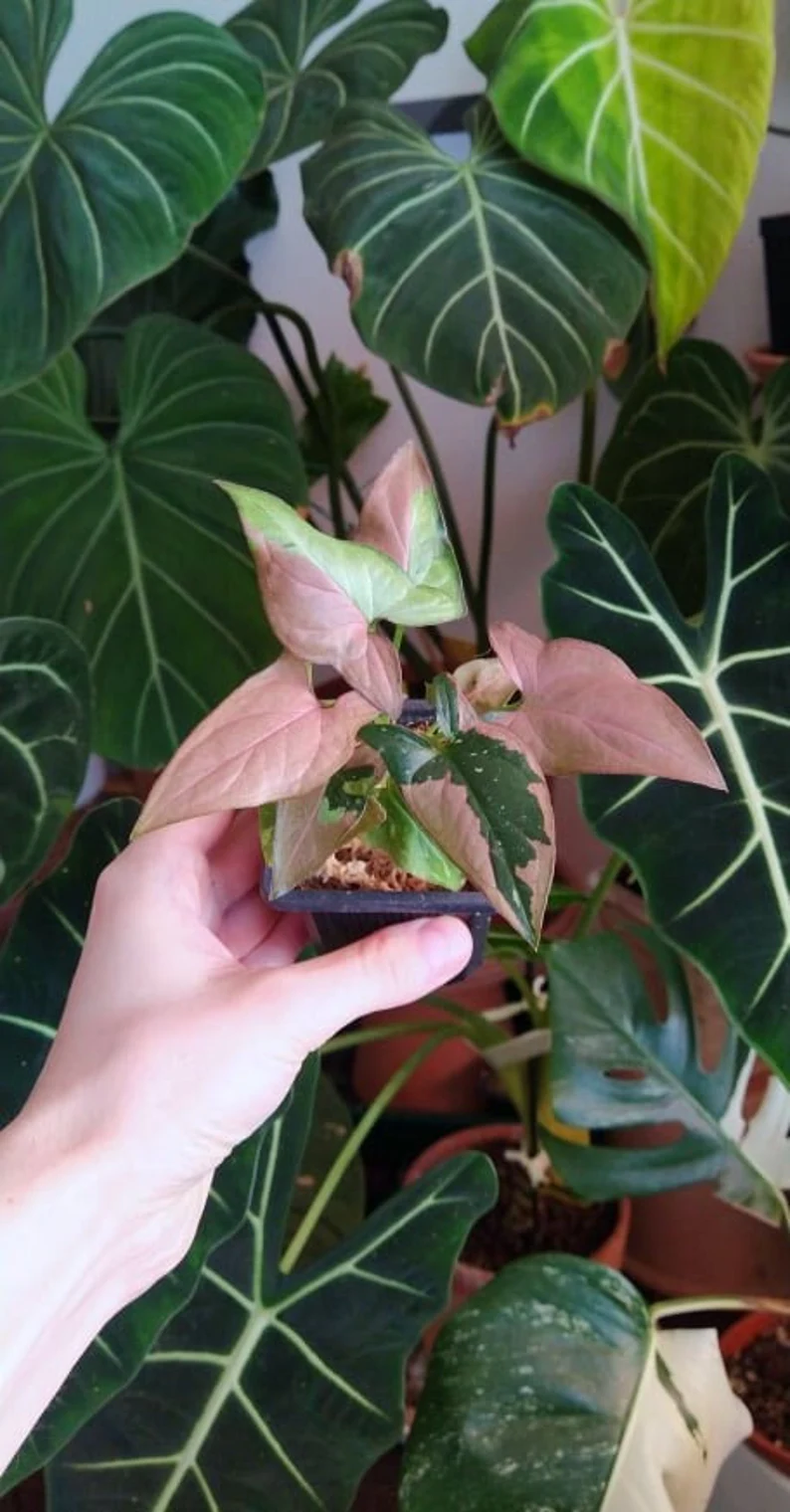 Tricolor variegation is very popular and rare possibility in plant kingdom. Especially when it is highly pink colorful! This rare and beautiful syngonium is already super rooted. It only needs good bright position towards the window with undirect sunlight. Sun could burn the variegation. Lack of light could also damage the variegation. This one has extremely cool stable amount of pink colors with foliage colored into white and green spectre. It loves climbing pole that allows you to grow huge triphyllum-leaves. These pictures show the exact plant you will get. The plant is S sized with extremely nice random splashes. It has undamaged super leaves with growth point. We also ship to U.S. states and overseas from EU on buyers own responsibility. Remember that you will get the plant that you see in pictures.